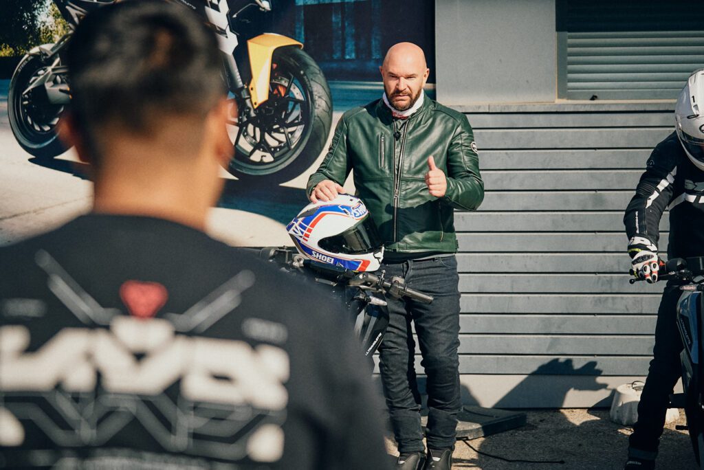 Equipamiento: Casco Shoei, Chaqueta Spidi, Pantalones Furygan, Guantes Five, Botas Dainese.