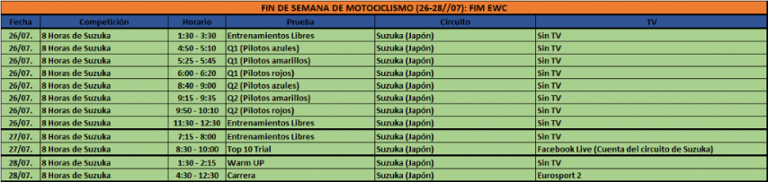 La acción en pista arrancará en la madrugada del viernes, con unos entrenamientos libres de dos horas que arrancarán a la 1:30. La primera clasificación tendrá lugar a las 4:50, dividida en tres sesiones, una cada para piloto, algo que se repetirá en la Q2, que empezará a las 8:40. Los libres nocturnos, a las 11:30 hora española, cerrarán el día. El sábado, tras los entrenamientos de las 7:15, será el turno del Top 10 Trial, a las 8:30, en el que se jugarán la pole los 10 equipos más rápidos de las QP del viernes, y que podrá seguirse en la cuenta de Facebook del circuito de Suzuka. Ya el domingo vendrá la nueva edición de las 8 Horas de Suzuka, que arrancarán a las 4:30 y que podrán verse en Eurosport 2 de forma íntegra.