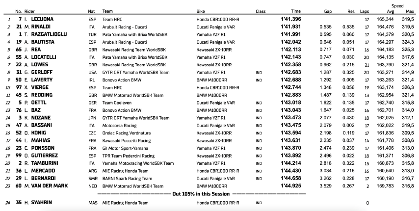 Sin embargo, el protagonista en el FP1 realizado en la mañana de este viernes es Iker Lecuona. El piloto español de Honda dominó el primer entrenamiento del día; justo detrás está Michael Rinaldi y, de la tercera a la quinta posición, el trío de cabeza en el Mundial. Fue Rinaldi el claro dominador durante toda la sesión, pero finalmente sería Lecuona quien marcaría el tiempo más rápido. El 1:41.396 dejó perplejos a todos y corroboró el gran paso adelante del piloto valenciano con Honda. Su compañero de equipo, Xavi Vierge, terminó el FP1 en décima posición.