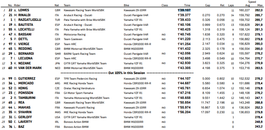 Por su parte, Álvaro Bautista ha podido llegar a un 1:51.118 para colocarse en el cuarto puesto, y para ver a Toprak hay que remontarse a la décima posición. Hay que destacar que parece que Alex Lowes llega con las pilas cargadas tras el verano, así que será interesante observar lo que ocurrirá mañana en la Superpole y la Carrera 1, así como el domingo en la Superpole Race y la Carrera 2.