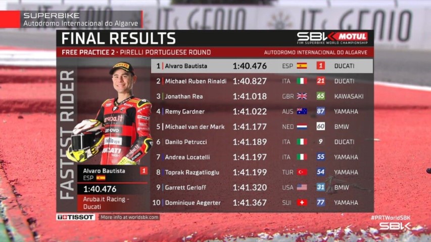 La segunda sesión de entrenamientos libres de WorldSBK en la Ronda de Portugal comenzaba con los pilotos mejorando sus tiempos de la mañana. Jonathan Rea era el primer piloto en situarse en lo más alto de la tabla. El norirlandés, sin embargo, era relegado rápidamente al cuarto lugar. Danilo Petrucci ocupaba entonces la cima de la tabla, seguido por Iker Lecuona y Álvaro Bautista.