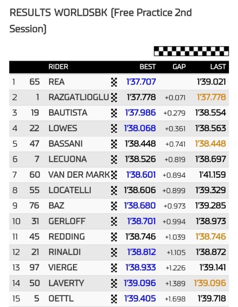 Mientras tanto, Andrea Locatelli repetía su tercera posición de la mañana, relegando a Bautista y Toprak al cuarto y quinto lugar respectivamente.