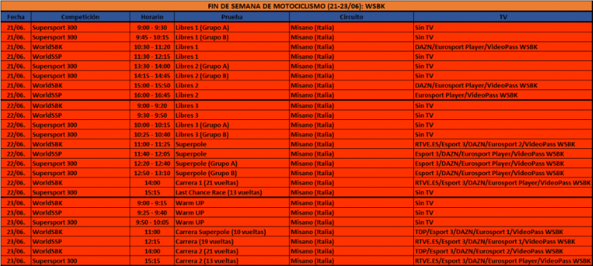 Los horarios del fin de semana serán los habituales. El viernes tendrán lugar los primeros entrenamientos libres (FP1 a las 9 y FP2 a las 13:30). El sábado será el turno de las Superpoles (WSBK a las 11, WSSP a las 11:40 y SSP 300 a las 12:20) y de la Race 1 de WSBK, a las 2 de la tarde. El domingo, tras los Warm UP, llegarán 4 carreras: la SP Race (11:00) y la Race 2 (14:00) de WSBK y las de WSSP (12:20) y SSP 300 (15:15). Toda la acción podrá seguirse en RTVE y Esport3 en abierto y en DAZN, Eurosport y el VideoPass del campeonato en pago.