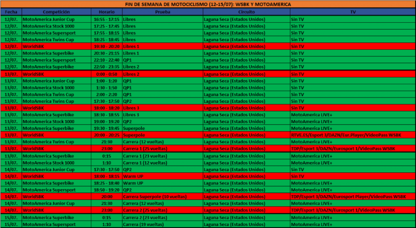 Así las cosas, la acción en pista arrancará este viernes, con sesiones desde las 16:55 en España, los libres de WSBK a las 19:30 de la tarde y a las 12 en punto de la noche, y los de SBK del MotoAmerica a las 20:30 y a las 22:50. El sábado, lo más importante serán las Superpoles de ambas categorías (el MotoAmerica a las 19:30 y WSBK justo después, a las 20:00) y las primeras carreras (23:00 y 0:15). El domingo, tras los Warm UP, vendrán las Superpole Race (20:00) y la Race 2 (23:00) de WSBK y la Race 2 del MotoAmerica (0:15). RTVE, Esport 3, DAZN, Eurosport y el VideoPass se volcarán con el Mundial, mientras que MotoAmerica LIVE+ ofrecerá lo mejor del campeonato nacional.