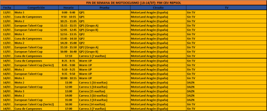 Lo más importante del fin de semana empezará el domingo, con dos sesiones de clasificación para todas las categorías, también para la Cuna de Campeones, que estará presente en Aragón y que cerrará la jornada con una carrera. El sábado, tras los Warm UP, llegarán las carreras desde las 11 de la mañana, con 2 para Moto 2 y la ETC y una para Moto 3. Todas ellas podrán verse en DAZN.