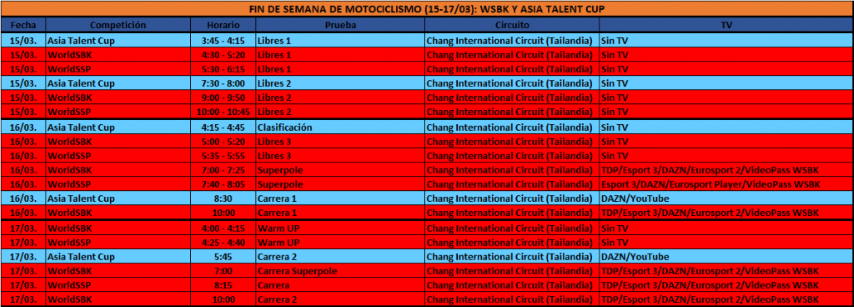 Finalmente, cabe destacar que la Asia Talent Cup será la categoría soporte con su segunda ronda, tras disputarse la primera hace una semana yendo de la mano de MotoGP en Qatar. Allí, el japonés Sho Nishimura fue el gran dominador, tras ganar con un gran ritmo la primera carrera, por más de 5 segundos sobre su compatriota Takuma Matsuyama y el tailandés Warit Thongnoppakun, e imponerse en la segunda mediante un duelo con el propio Matsuyama por tan solo 20 milésimas. En este caso, las carreras en Chang tendrán lugar el sábado a las 8:30 y el domingo a las 5:45, y podrán seguirse junto a WSBK en DAZN.