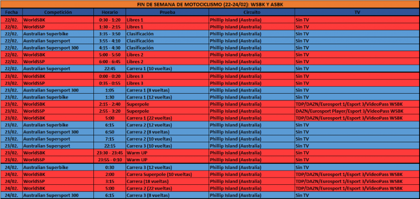 Así pues, el viernes tendrán lugar los primeros entrenamientos libres, entre las 0:30 y las 2:15, y posteriormente los segundos, entre las 5 y las 6:45 de la mañana, hora española. En la madrugada del sábado, será el turno de las Superpoles de WSBK (2:15) y WSSP (2:55) y de la primera carrera de WSBK, a partir de las 5, aunque habrá acción en pista gracias a las carreras del Australian Superbike desde las 22:45 de la noche del viernes. El domingo, terminará el fin de semana con el debut de la Superpole Race de WSBK (2:00) y de la Race 2 (5:00) y con la carrera inaugural de Supersport 600, a las 3:15.