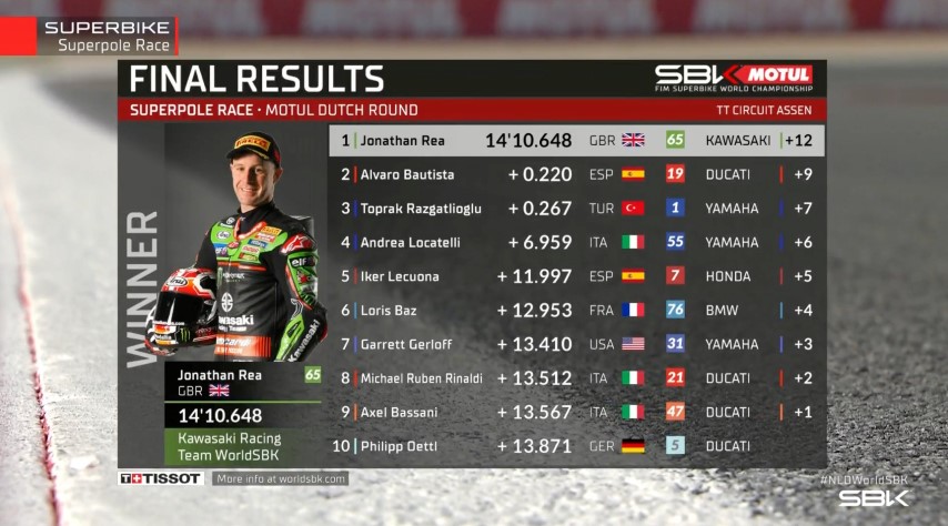 Jonathan Rea ha logrado una nueva victoria con récord incluido: su victoria número 100 con Kawasaki. Álvaro Bautista y Toprak Razgatliouglu han completado el podio de la SuperPole Race de la ronda de Assen.