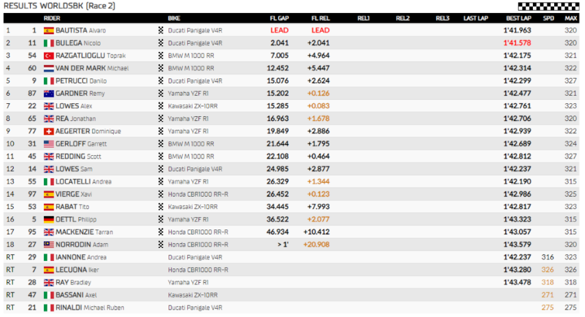 Bautista ha vuelto a recuperar la cabeza de carrera a 11 vueltas del final. También Razgatlioglu se les ha acercado un poco en este momento, aunque aún sin posibilidad de lanzar un ataque sobre los de Ducati. Las posiciones se han mantenido igual, hasta que a 8 vueltas del final, Andrea Iannone se ha ido al suelo. Esto ha dejado en bandeja la cuarta posición a Michael van der Mark.
