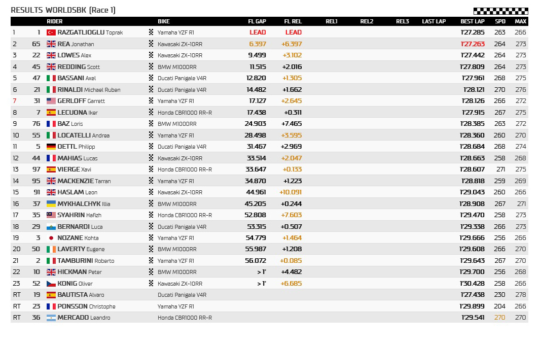 Se apagaron los semáforos en el soleado y caluroso sábado de carreras en el trazado británico de Donington Park y Toprak, como ya hiciese el año pasado, salió como un auténtico disparo colocándose en primera posición antes de llegar a la primera curva. A partir de ahí el piloto turco no dio margen a sus rivales y comenzó a abrir un hueco que sería definitivo. Después de un inicio complicado de temporada, el de Yamaha logra su primera victoria en carrera larga y recorta puntos a Rea y Bautista.