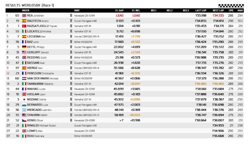 Jonathan Rea. Álvaro Bautista. Toprak Razgatlioglu. Los tres pilotos mencionados se han propuesto dar espectáculo en cada carrera que haya en WorldSBK. En la Race 1 en Assen, ha sido Rea quien ha salido vencedor tras una agónica prueba. Para el británico es la segunda victoria de la temporada, la primera fue en el primer Round en Aragon. Además, Rea es ahora el nuevo líder del Mundial de Superbike. Bautista, segundo; y Razgatlioglu, tercero; acompañan al de Kawasaki en el podio. Cabe resaltar también la meritoria quinta plaza de Iker Lecuona. En el día de ayer el piloto de Honda sufría una durísima caída; hoy, ya recuperado, termina en el top5 por primera vez en la temporada.