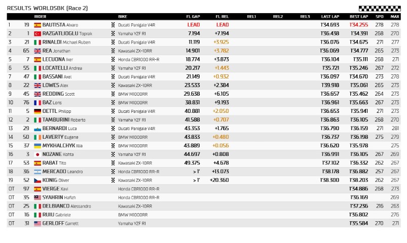Mientras tanto, el de Kawasaki y el de Ducati protagonizaban la lucha por cerrar el podio en el trazado italiano; lo que ha facilitado las cosas al piloto de Yamaha para ganar cómodamente. La primera fila de la Carrera 2 la han completado, por tanto, Álvaro Bautista y Jonathan Rea. Los pilotos de Honda, Xavi Vierge e Iker Lecuona, se han quedado a las puertas del podio; en cuarto y quinto lugar respectivamente. Andrea Locatelli, por su parte, ha finalizado sexto.