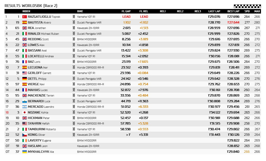 La carrera se ha desarrollado con un grupo de tres en cabeza. Jonathan Rea no ha perdido la rueda de Toprak Razgatlioglu, que cerraba cada hueco disponible. Por detrás, Bautista ha seguido muy de cerca al irlandés; con Redding esperando su oportunidad para meterse en la lucha por el podio. Un error de Rea, abriéndose demasiado en el paso por curva, ha permitido a Toprak ganar algo de ventaja, mientras que Bautista se ha acercado más a la rueda de la Kawasaki.