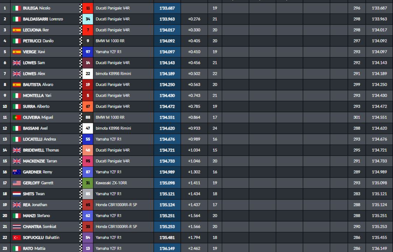 El top 10 del viernes dejó varios nombres destacados. Álvaro Bautista fue séptimo, seguido por Yari Montella y Alberto Surra, mientras que otros pilotos habituales como Axel Bassani o Andrea Locatelli quedaron más retrasados.