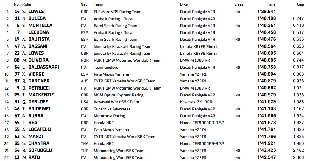 Más allá del liderato de Lowes, el día dejó una imagen clara en la clasificación: la superioridad de la marca italiana, que logró situar varias de sus motos en las posiciones delanteras y marcar diferencias desde el primer momento en Portimao.
