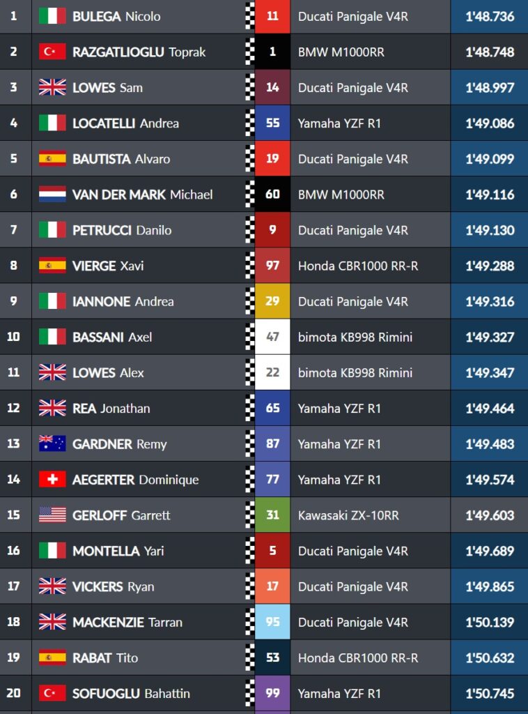 Al término de los 45 minutos, Nicolò Bulega se quedó con el mejor registro, relegando a Toprak Razgatlioglu a la segunda posición. Sam Lowes completó el podio provisional de la sesión, seguido de Andrea Locatelli y Álvaro Bautista, quienes cerraron el top cinco. La dinámica de la sesión confirmó que, mientras Toprak y Bulega se sitúan en un nivel claramente superior para la lucha por la victoria, el resto del grupo mantiene la capacidad de sorprender y de jugar un papel clave en la definición de las posiciones de cabeza.