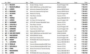 La sesión terminó con Bulega en cabeza, seguido por Razgatlioglu y Alex Lowes cerrando el top 3. Completaron las diez primeras posiciones Bassani, Vickers, Rea, Vierge (mejor español del día), Sam Lowes, Gardner y Locatelli. Entre los demás españoles, Bautista fue 11, Rabat fue 17 tras su caída y Lecuona 18, condicionado también por su incidente.