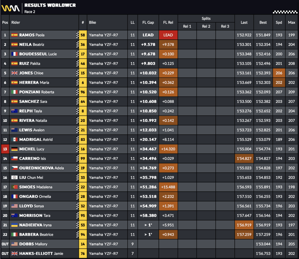 La victoria de Ramos, impecable de principio a fin, supone un golpe de efecto dentro del campeonato. Su ritmo constante, su madurez al manillar y su capacidad para aislarse del caos trasero la convierten en una de las grandes revelaciones del año. El Mundial Femenino tiene en ella un nuevo nombre propio.