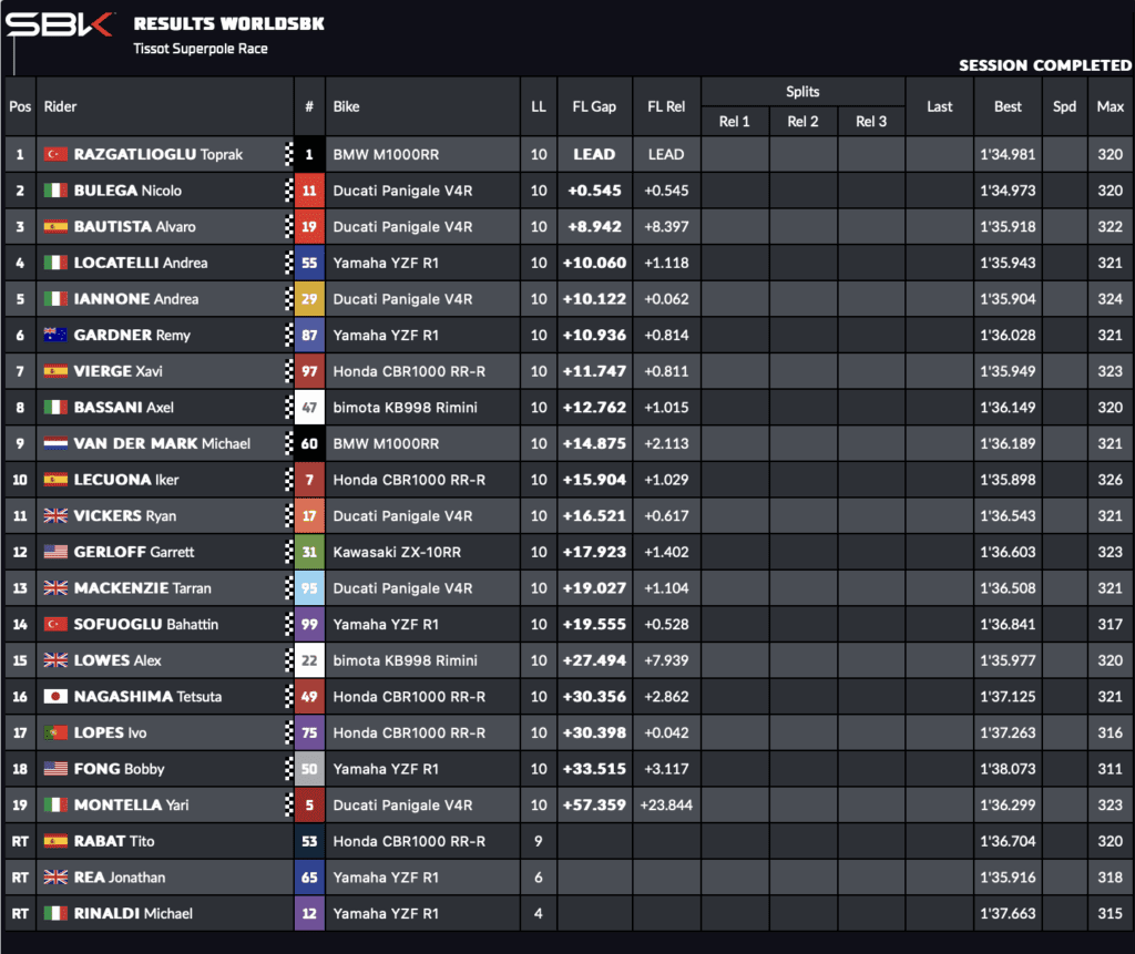 El podio final quedó encabezado por Toprak Razgatlioglu (BMW), seguido de Nicolò Bulega (Ducati) a medio segundo y Álvaro Bautista (Ducati), que volvió a ser el mejor español del día. La marca bávara celebró además su victoria número 57 en el campeonato, reforzando un año excepcional de la mano del piloto turco.