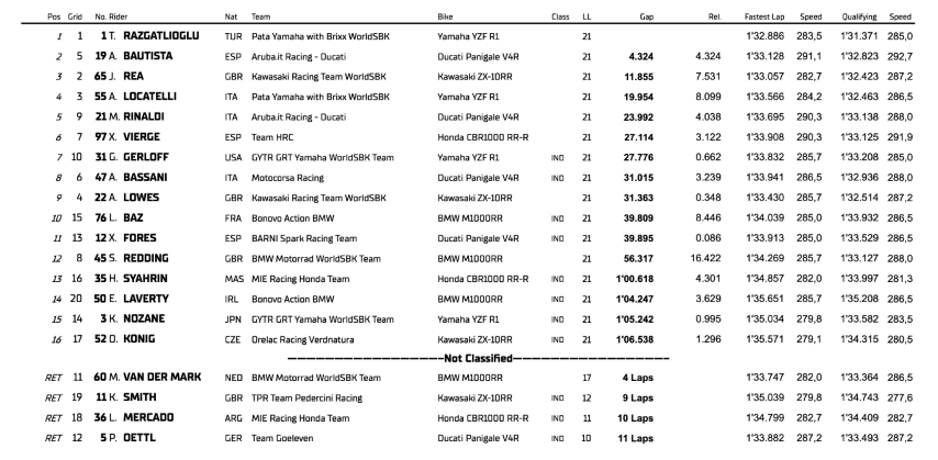 Matemáticamente, Bautista se podría proclamar aquí campeón, pero los resultados que necesita son difíciles. El español necesita 17 puntos más que Toprak y 1 más que Rea. Pero a falta de 15 vueltas, Bautista sigue en tercera posición, por detrás justo de ellos. Los otros españoles, Xavi Vierge se disputa la séptima posición con Michael Rinaldi y Xavi Forés se sale de pista y se separa del grupo.