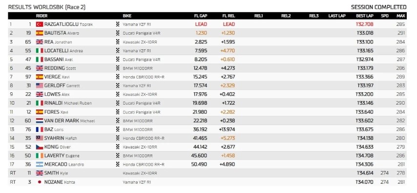 El turco ha mantenido el liderato hasta el paso por línea de meta, con Bautista segundo. El español se convertía así en Campeón del Mundo de WorldSBK, con Rea cerrando el podio. Este es el segundo título de WorldSBK para un piloto español desde Carlos Checa.