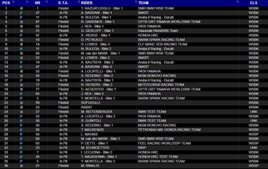 Con una tarde bastante más animada, los pilotos continuaban mejorando sus tiempos y sus sensaciones. Era el caso de Jonathan Rea, quien llegaba a la cuarta posición de la tabla al tiempo que daba pasos adelante junto a Yamaha. Mientras Toprak continuaba mejorando su tiempo, Bulega ascendía hasta la segunda plaza con una vuelta de 1:42.182.