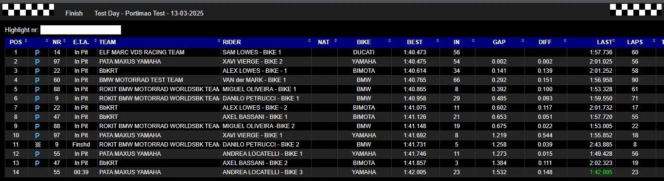 Después de que el mundial de Superbikes empezara hace prácticamente tres semanas en Australia, donde el gran favorito para este año Niccolò Bulega arrasase tannto en la sprint como en las dos carreras, vuelve al circuto de Portimao. Los test concluyeron el pasado viernes por la tarde, unas pruebas que han estado marcadas por la lluvia y el mal tiempo toda la semana. Sin embargo, solo los equipos Binota, Pata Yamha, BMW y Marc VDS decidieron rodar por el trazado portugués aprovechando las mejoras del pronóstico metereológico, con el objetivo de prepararse para la siguiente Ronda del Algarve, que se celebrará del 27 al 29 de Marzo, la semana que viene.