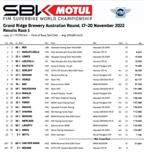 Se apaga el semáforo y Bautista mantiene la primera posición, Toprak se coloca segundo y Rea tercero. Kohta Nozane no termina la primera vuelta y entra en el box. Rea tiene ganas de ganar y se coloca primero. El piloto de Kawasaki lleva 24 carreras sin ganar, siendo su segunda peor racha. Álvaro Bautista baja a la cuarta posición por detrás de Lowes.