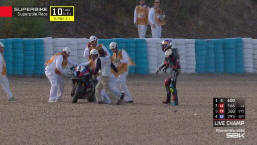 Bulega se llevaba así los doce puntos de la Superpole Race, con Bautista y Andrea Iannone cerrando el podio. El título de Campeón del Mundo tendrá que esperar a la Carrera 2 para decidirse, con una tensión más que evidente en el paddock de WorldSBK. Fuera del podio se quedaba Xavi Vierge, con Lowes cerrando el Top5 de la clasificación. Precisamente Alex Lowes recriminaba a Bulega su acción sobre Toprak al inicio de la carrera, mientras el italiano recibía abucheos por parte del público. En cualquier caso, la diferencia entre ambos pilotos se reducía hasta 22 puntos; y al turco le bastaría con la décimo segunda posición para ser Campeón en caso de que Bulega venza en la carrera.